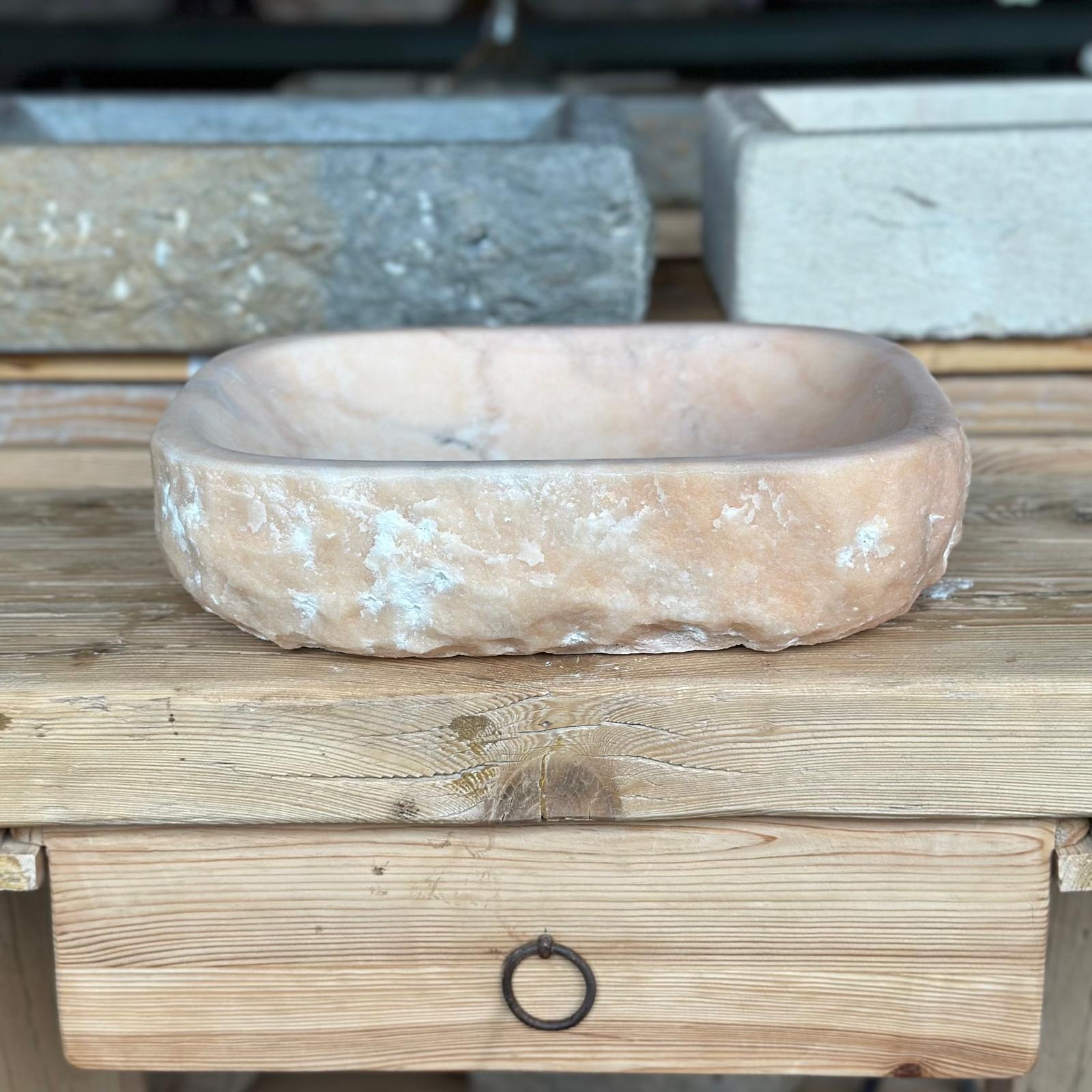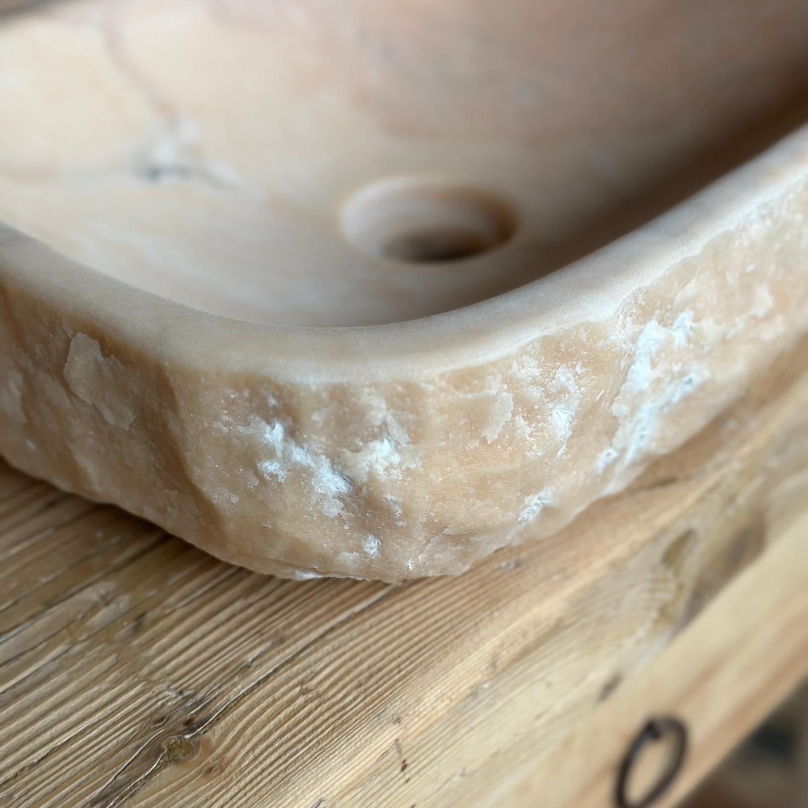 La pica «Alvor» está tallada a mano en piedra natural de Portugal, con un característico tono cálido que aporta luminosidad y elegancia. Su exterior en bruto refleja la autenticidad de la roca, mientras que el interior suavemente pulido garantiza confort y practicidad en el uso diario.