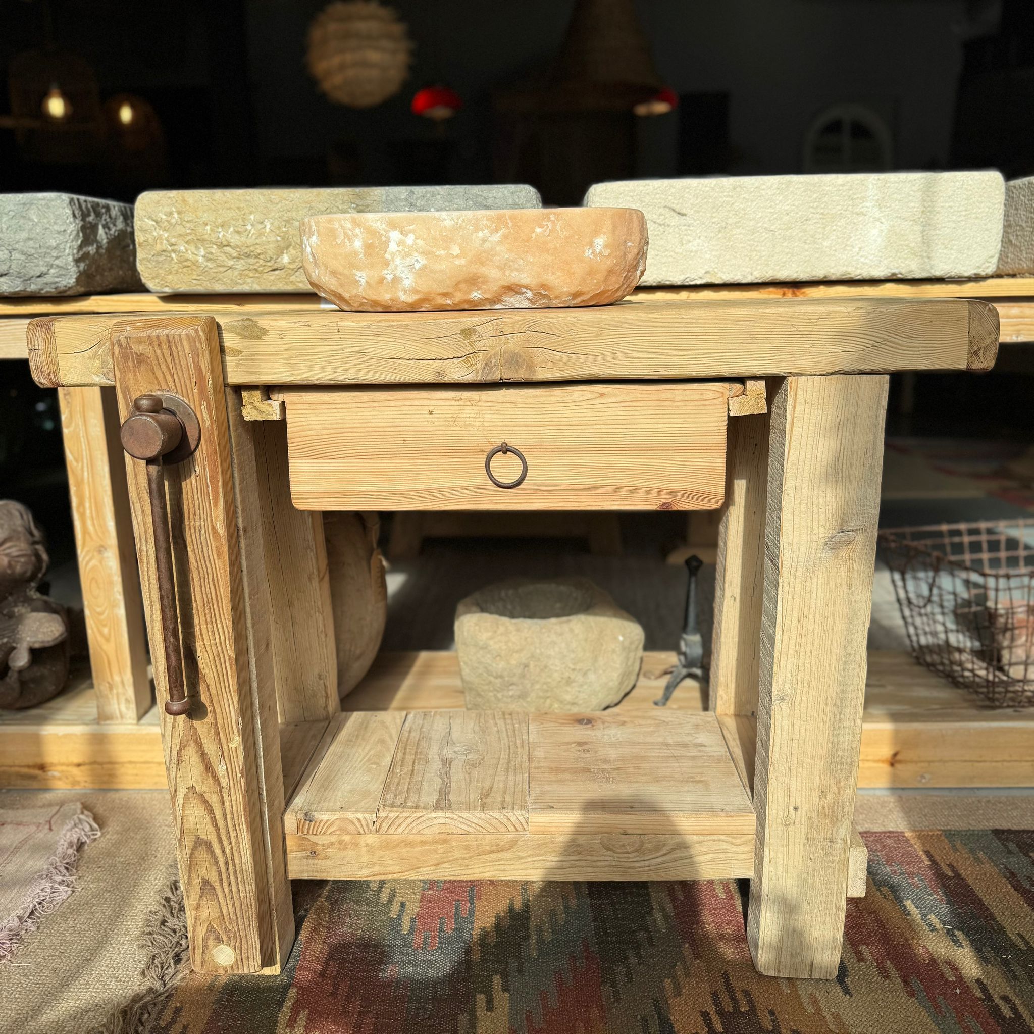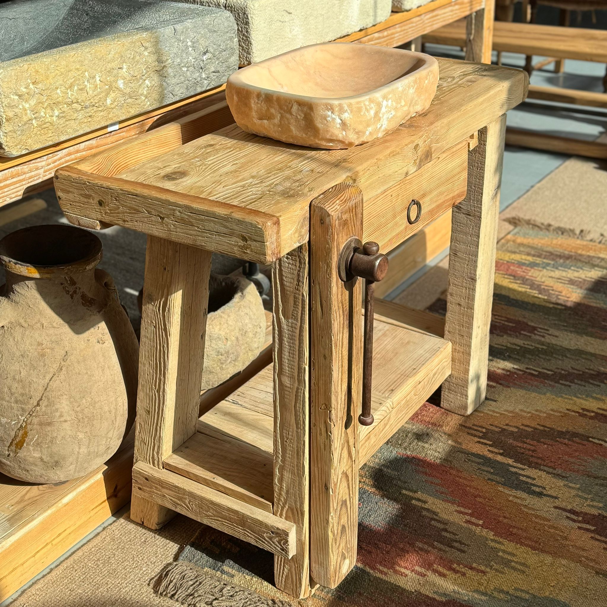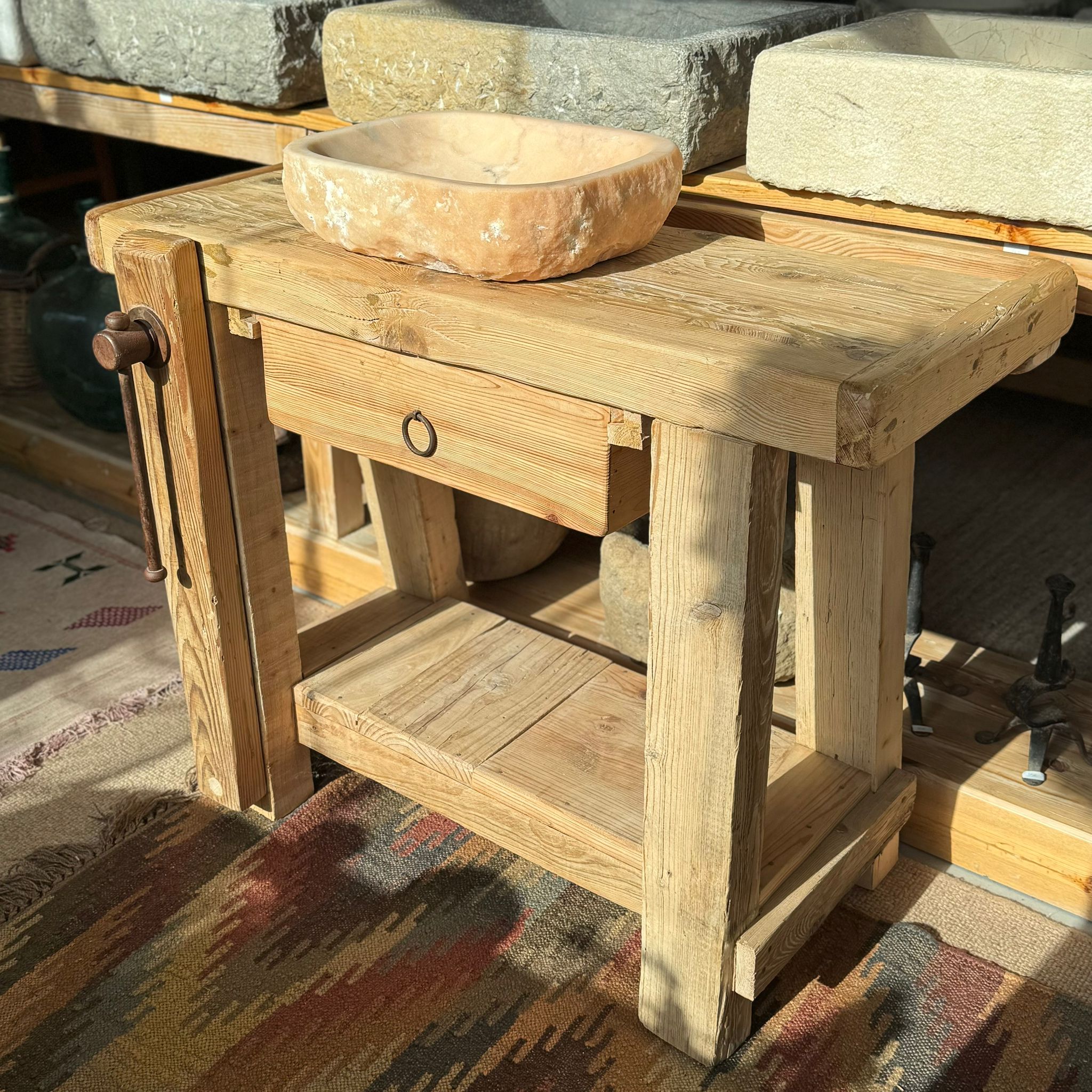 Este banco de carpintero recuperado y transformado en mueble de baño es una pieza artesanal única. Fabricado en madera maciza de pino viejo, conserva los detalles originales —como el tornillo de banco y el cajón frontal— que le aportan un encanto rústico incomparable. Al combinarlo con una de nuestras picas de piedra, se convierte en un conjunto exclusivo que aporta carácter y autenticidad a cualquier baño.