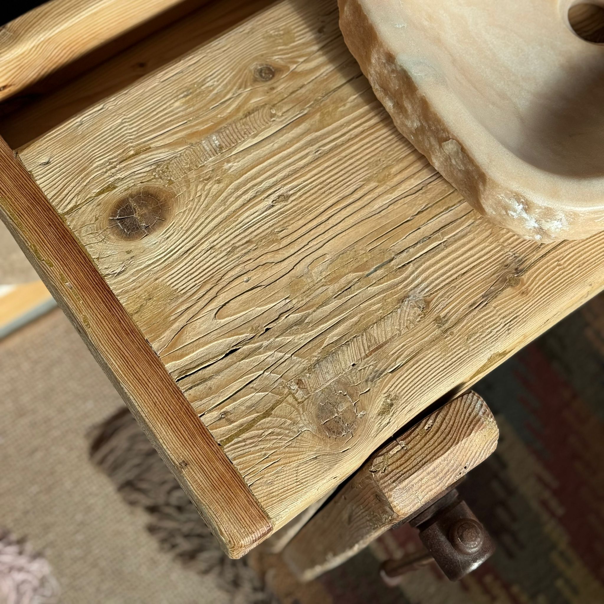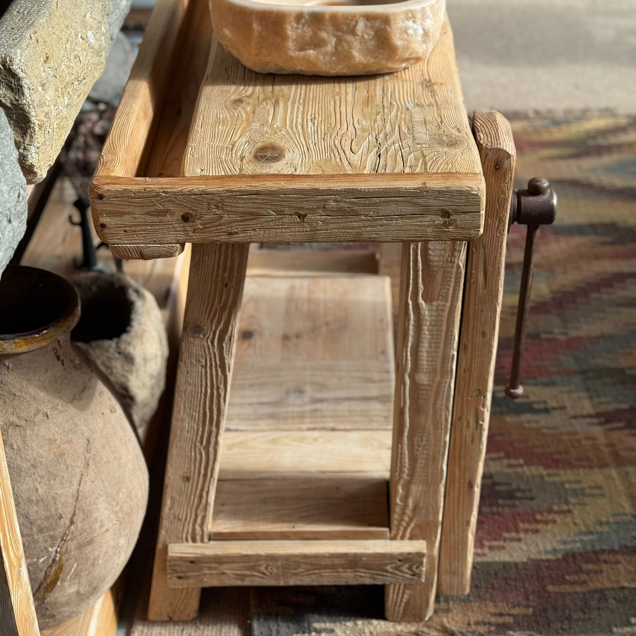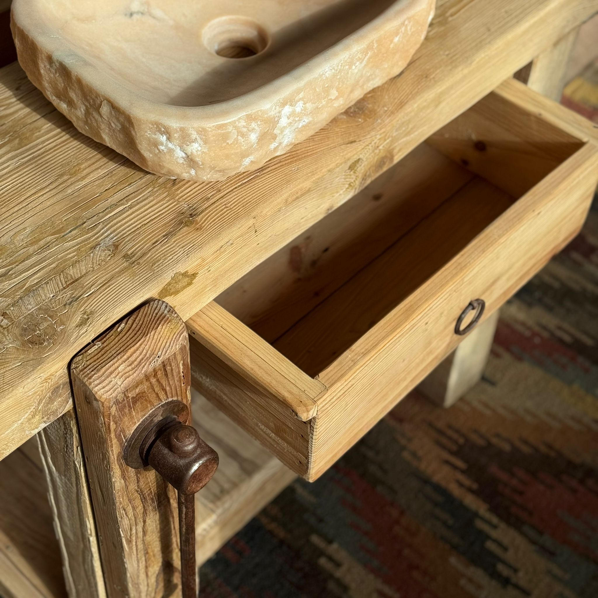 Este banco de carpintero recuperado y transformado en mueble de baño es una pieza artesanal única. Fabricado en madera maciza de pino viejo, conserva los detalles originales —como el tornillo de banco y el cajón frontal— que le aportan un encanto rústico incomparable. Al combinarlo con una de nuestras picas de piedra, se convierte en un conjunto exclusivo que aporta carácter y autenticidad a cualquier baño.