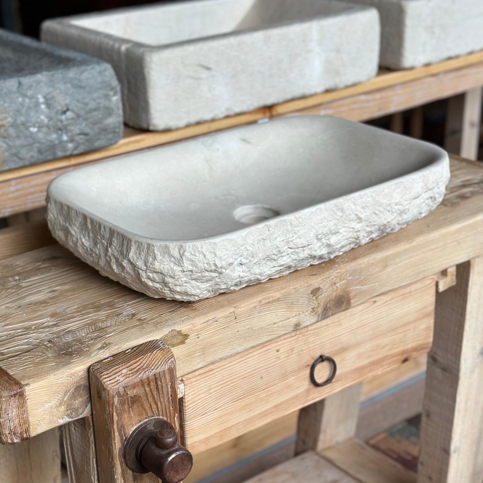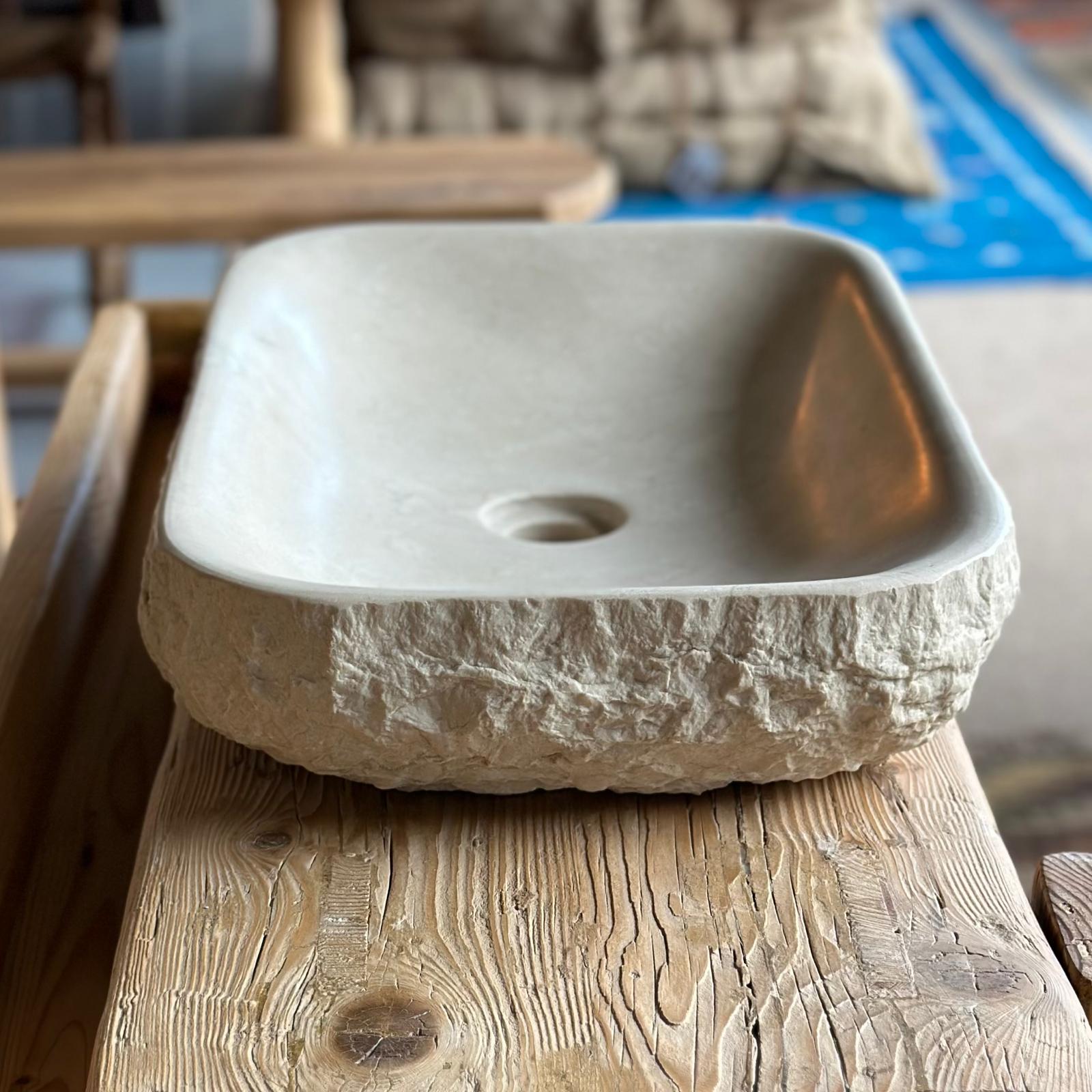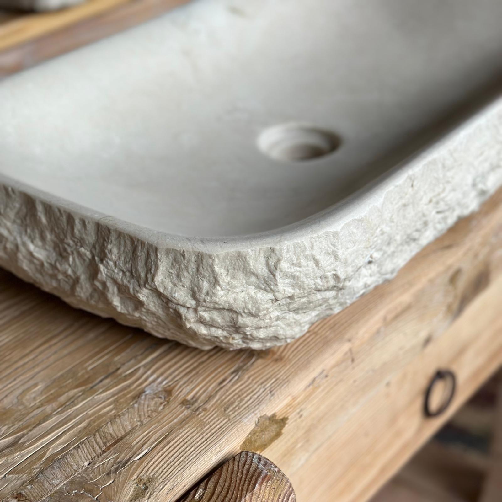 «Empordanesa» es una pica que respira calma. Su diseño alargado, de bordes redondeados y textura natural, la convierte en una pieza atemporal ideal para baños que buscan una atmósfera sencilla, cálida y con carácter. Tallada completamente a mano en piedra natural de Crema Marfil, conserva la textura rugosa del exterior contrastando con el interior pulido, creando un equilibrio entre naturaleza y comodidad.