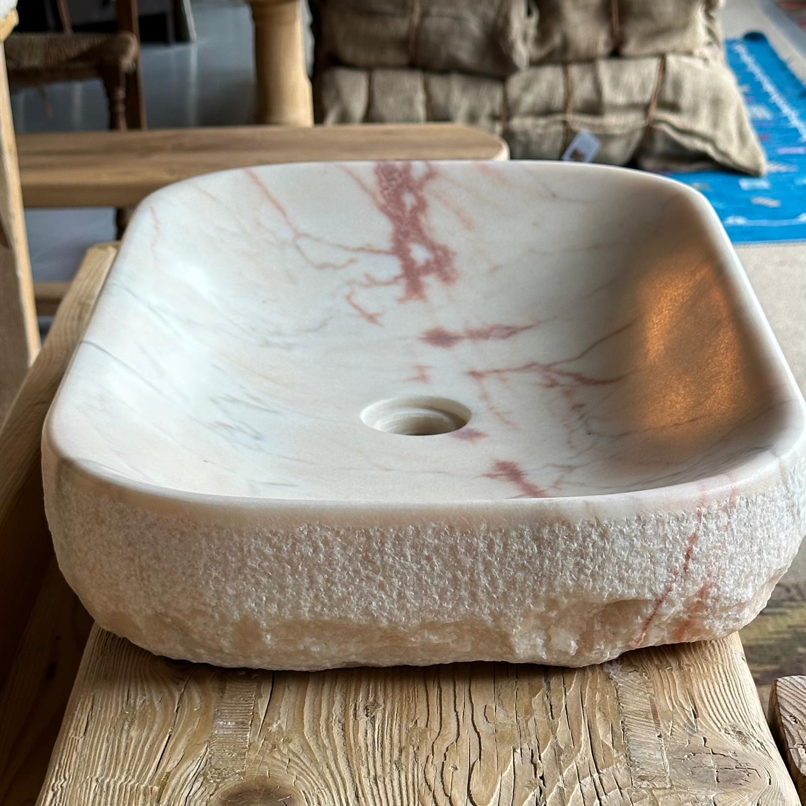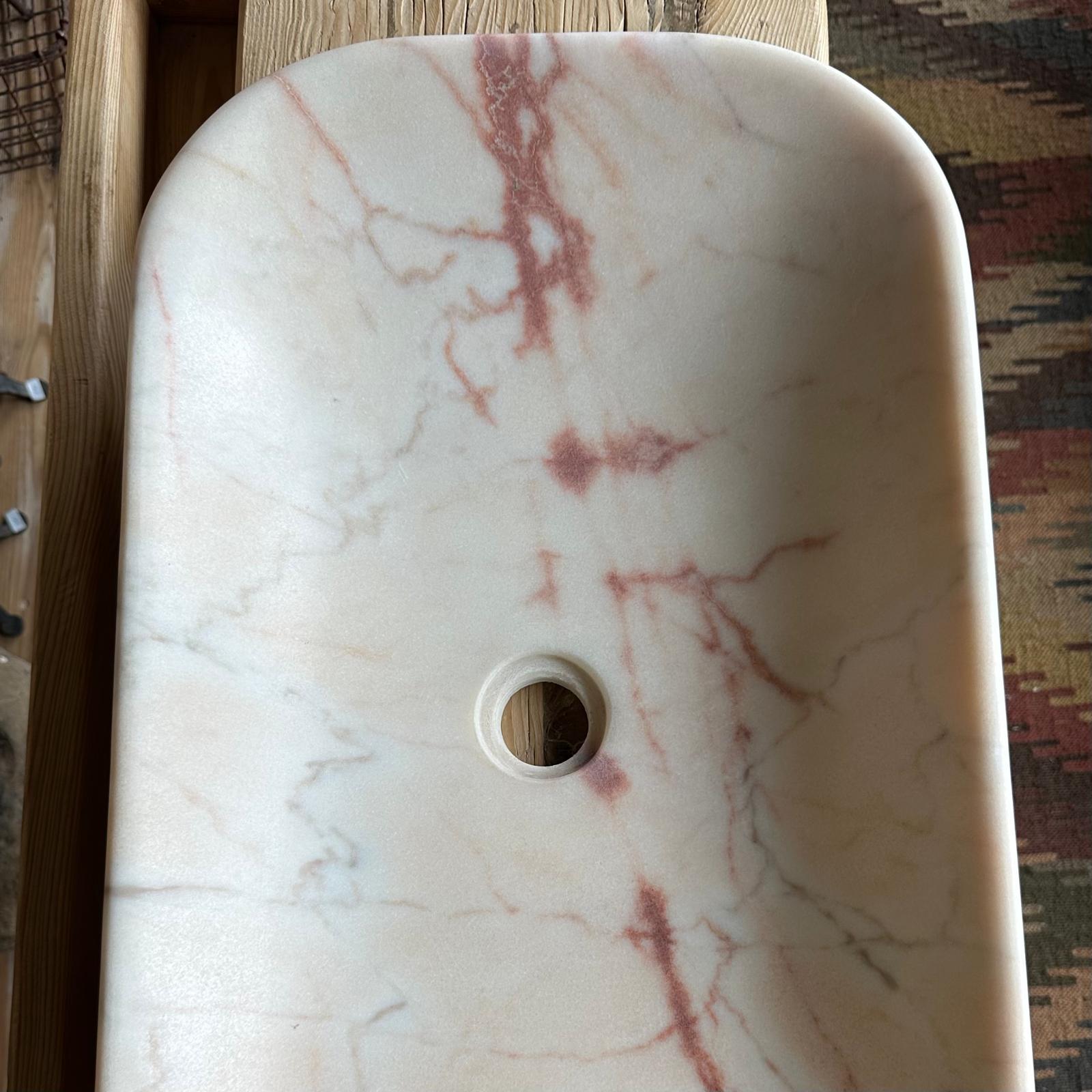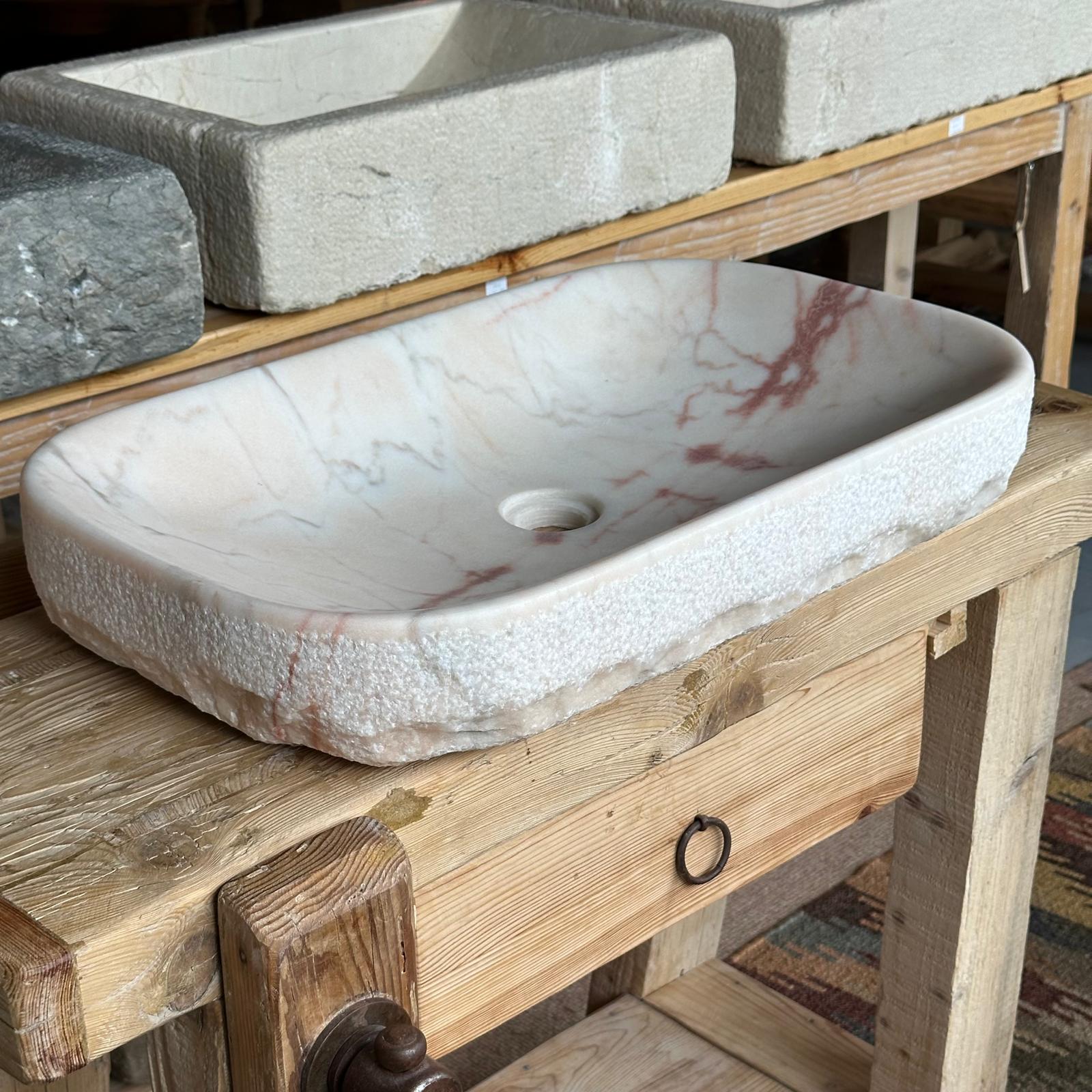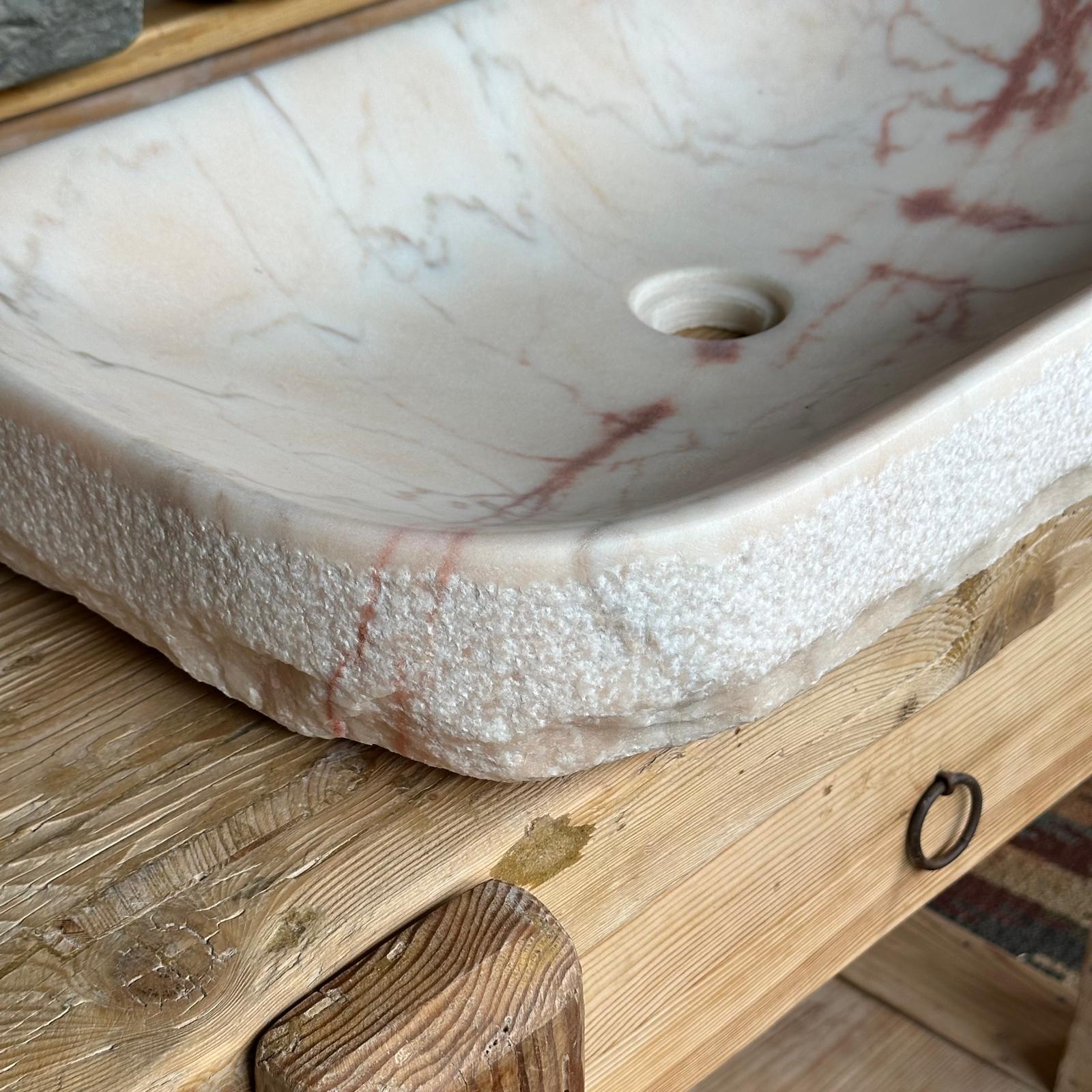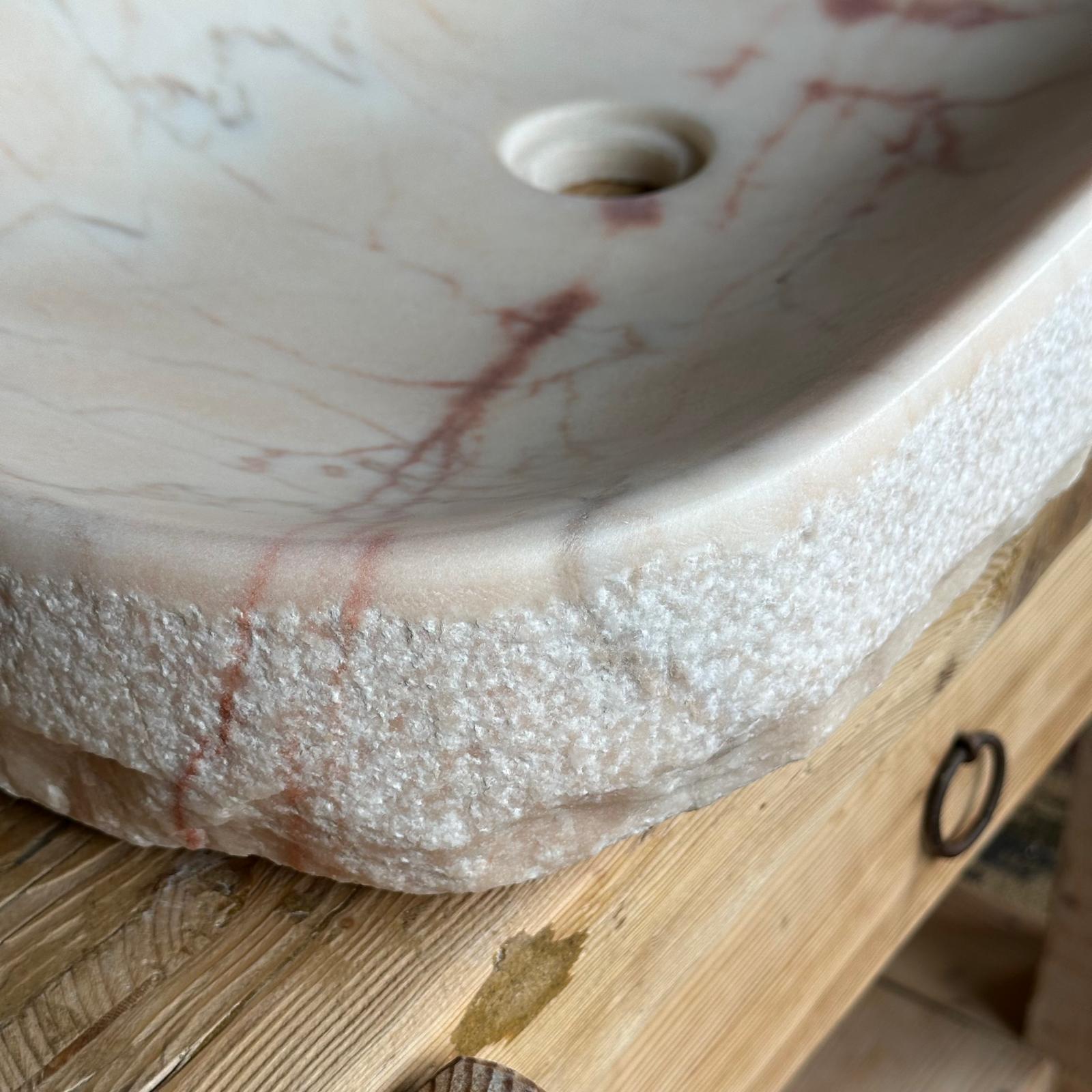La pica «Lisboa» captura la belleza refinada de la piedra portuguesa. Su interior liso y cálido contrasta con la textura natural del exterior, en una pieza que combina modernidad con el respeto por la materia prima. Las vetas rojizas que recorren la piedra crean un dibujo orgánico e irrepetible, haciendo de cada unidad una obra con identidad propia.