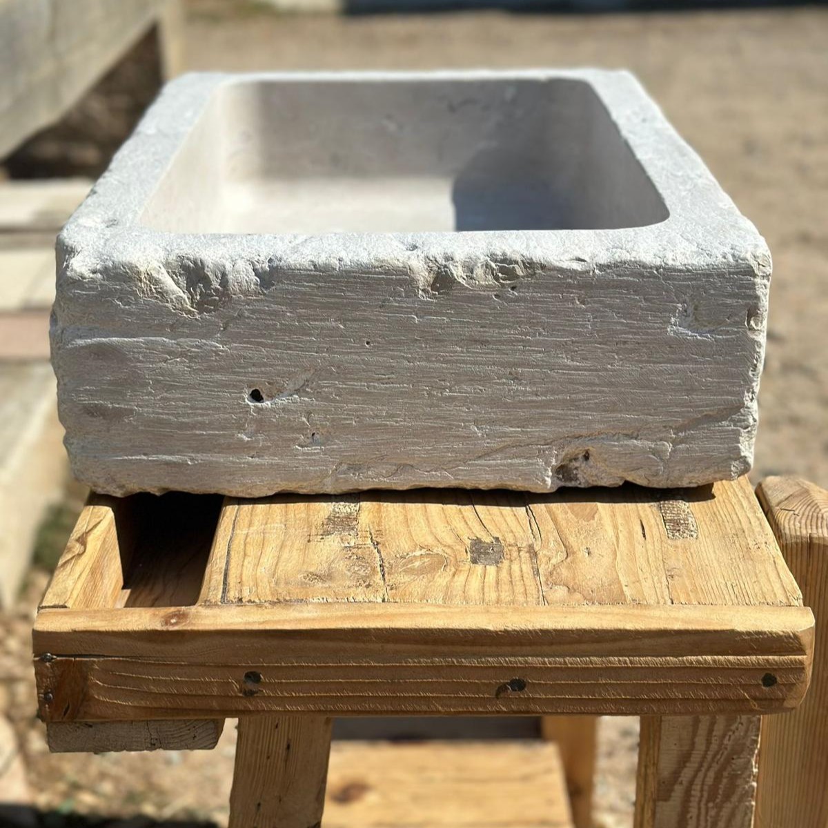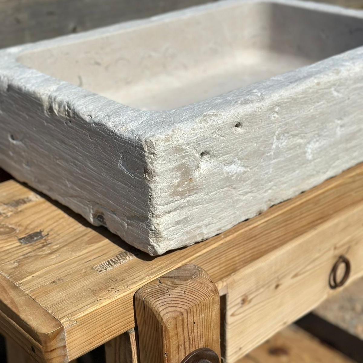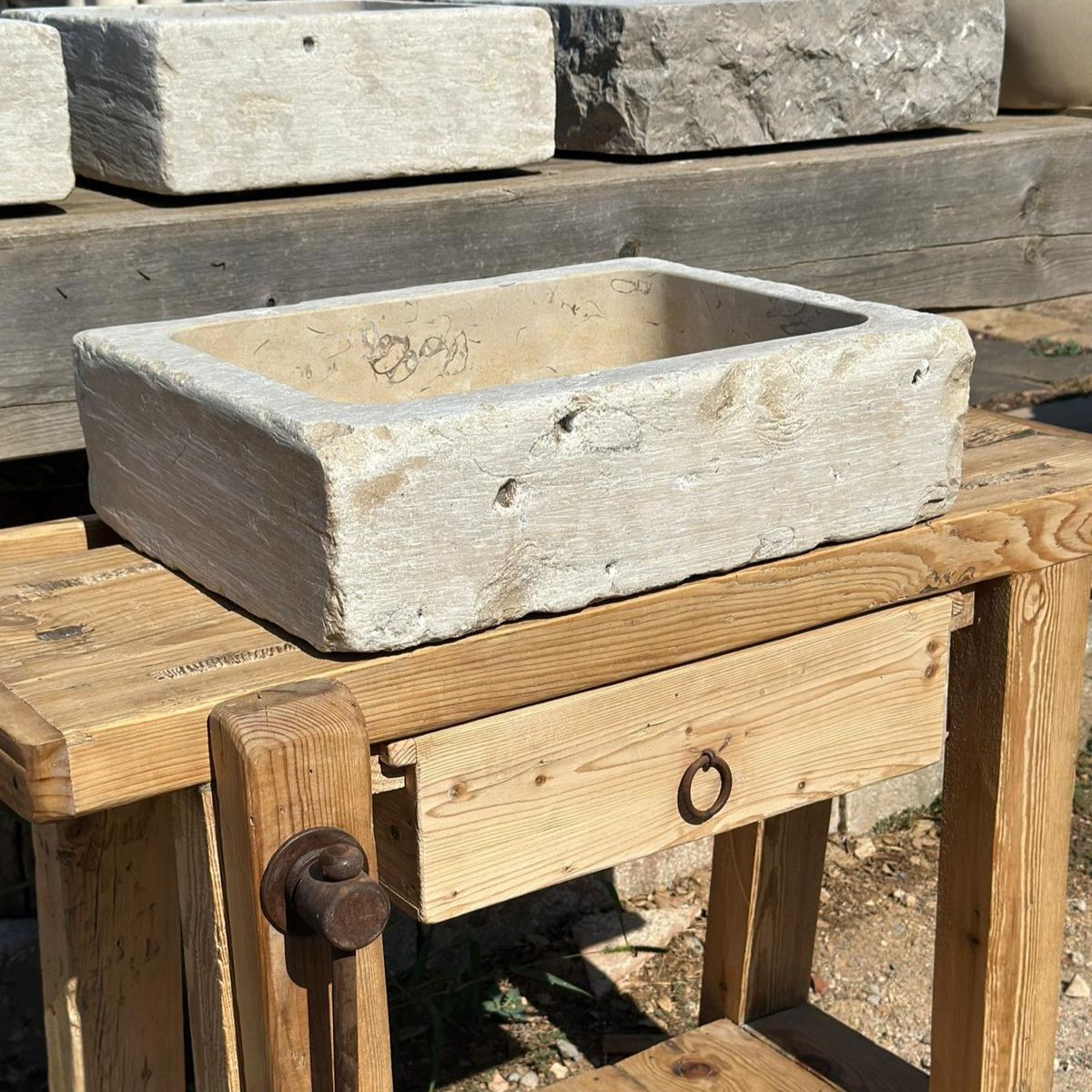 La pica «Montsant» está tallada a mano en piedra natural de Portugal. Su diseño rectangular de bordes rectos y textura exterior rústica refleja autenticidad, mientras que el interior pulido garantiza practicidad y elegancia. Una pieza versátil que encaja en baños de estilo rústico, contemporáneo o mediterráneo.