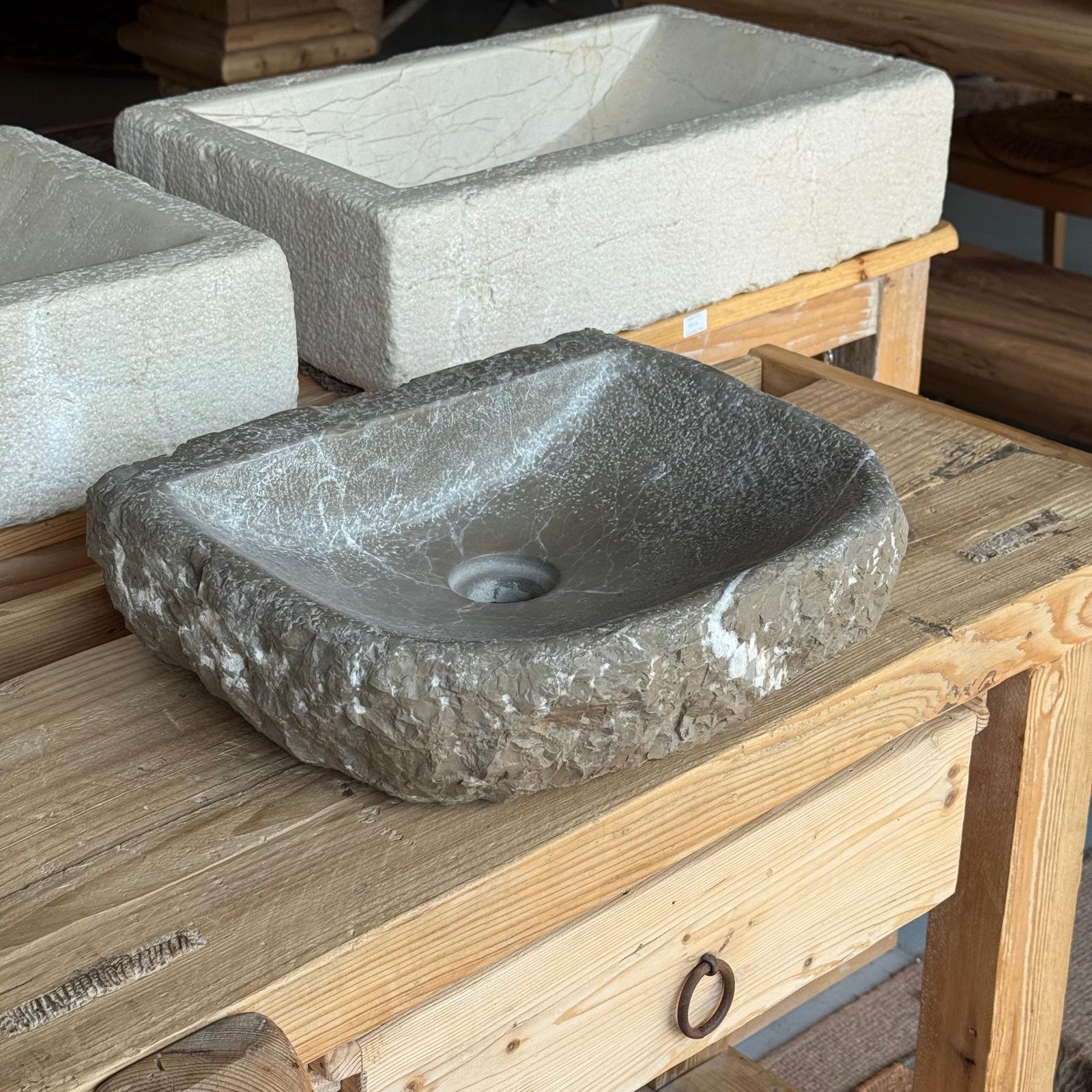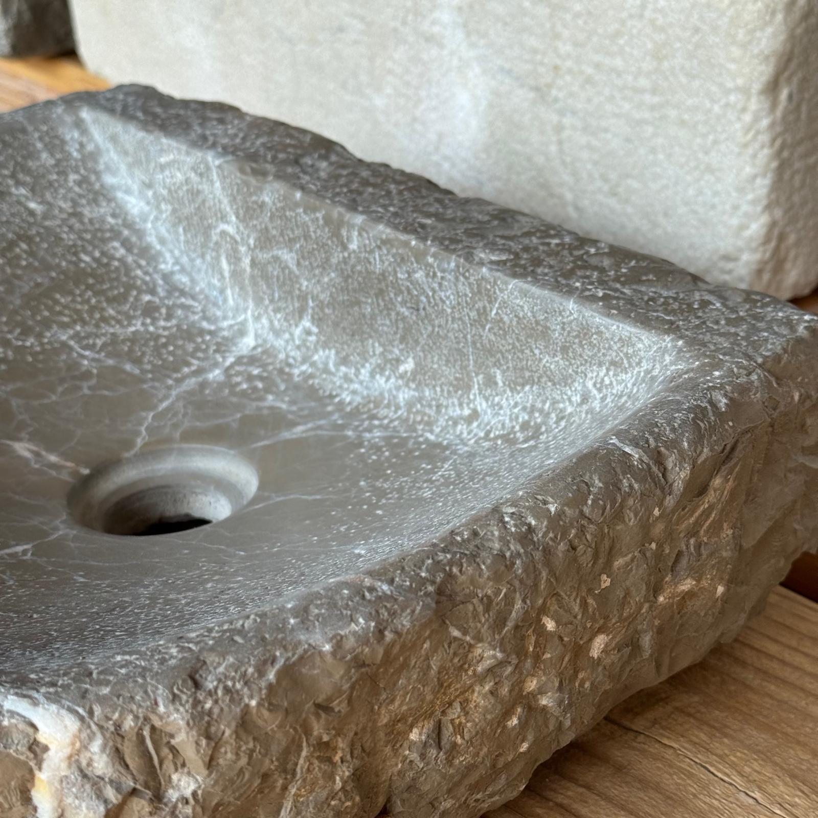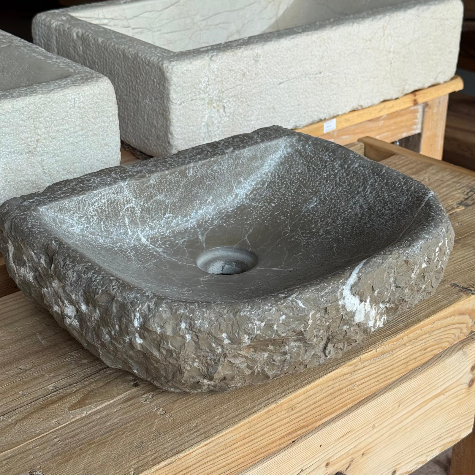 Inspirada en la imponente serra del Montsec, esta pica cuadrada combina la crudeza de la roca con la suavidad de un interior trabajado a mano. La piedra natural oscura de Lleida aporta una estética sobria y elegante, marcada por vetas y texturas que la convierten en un lavabo escultórico y único.