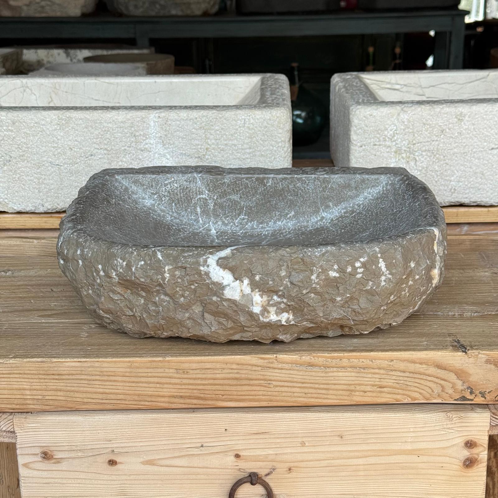 🪨 Material: Piedra natural oscura de Lleida, exterior en bruto e interior pulido
