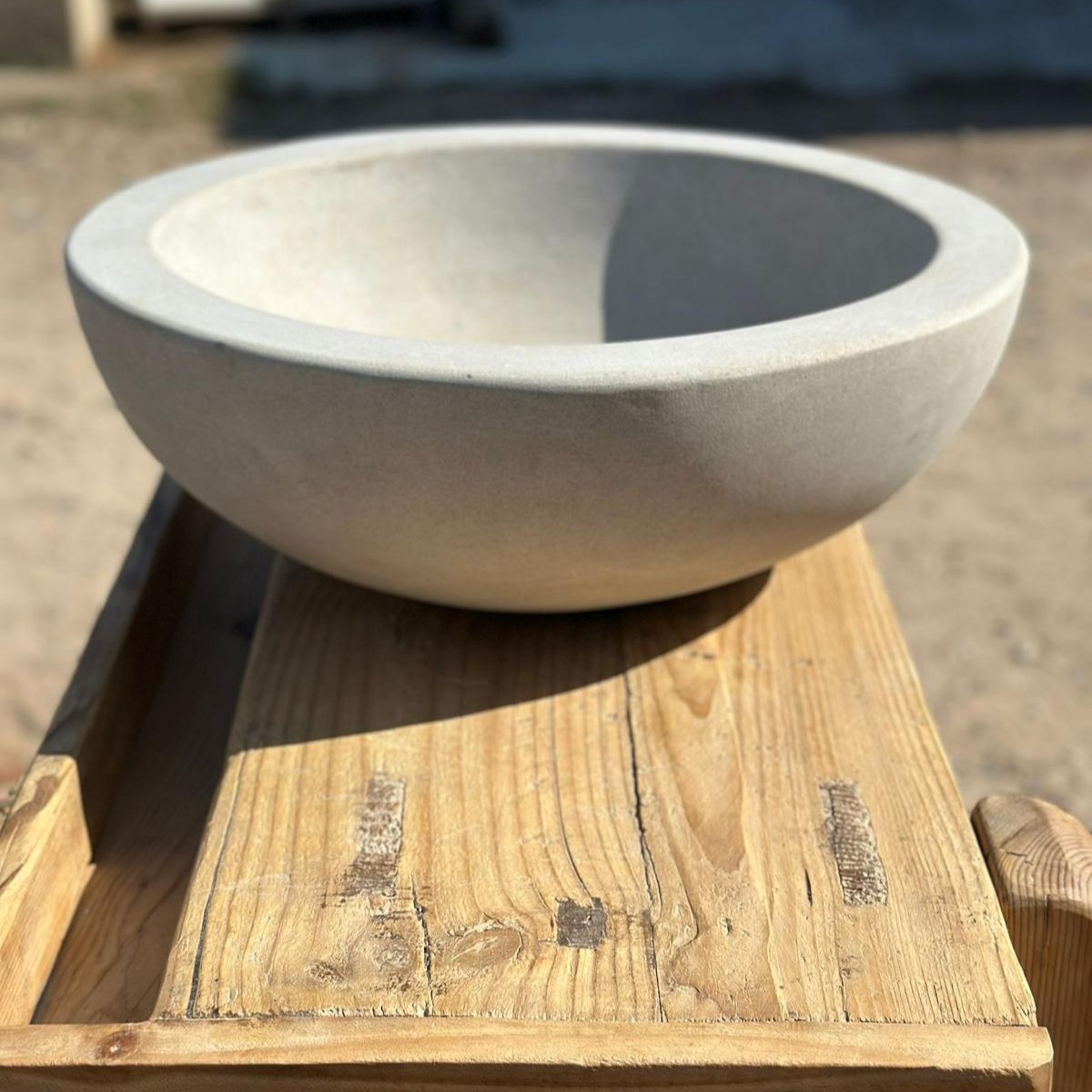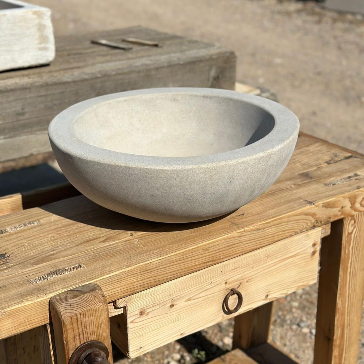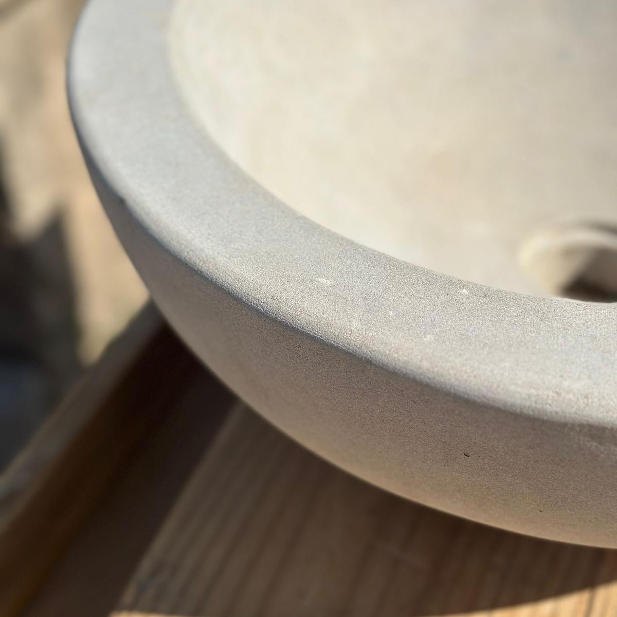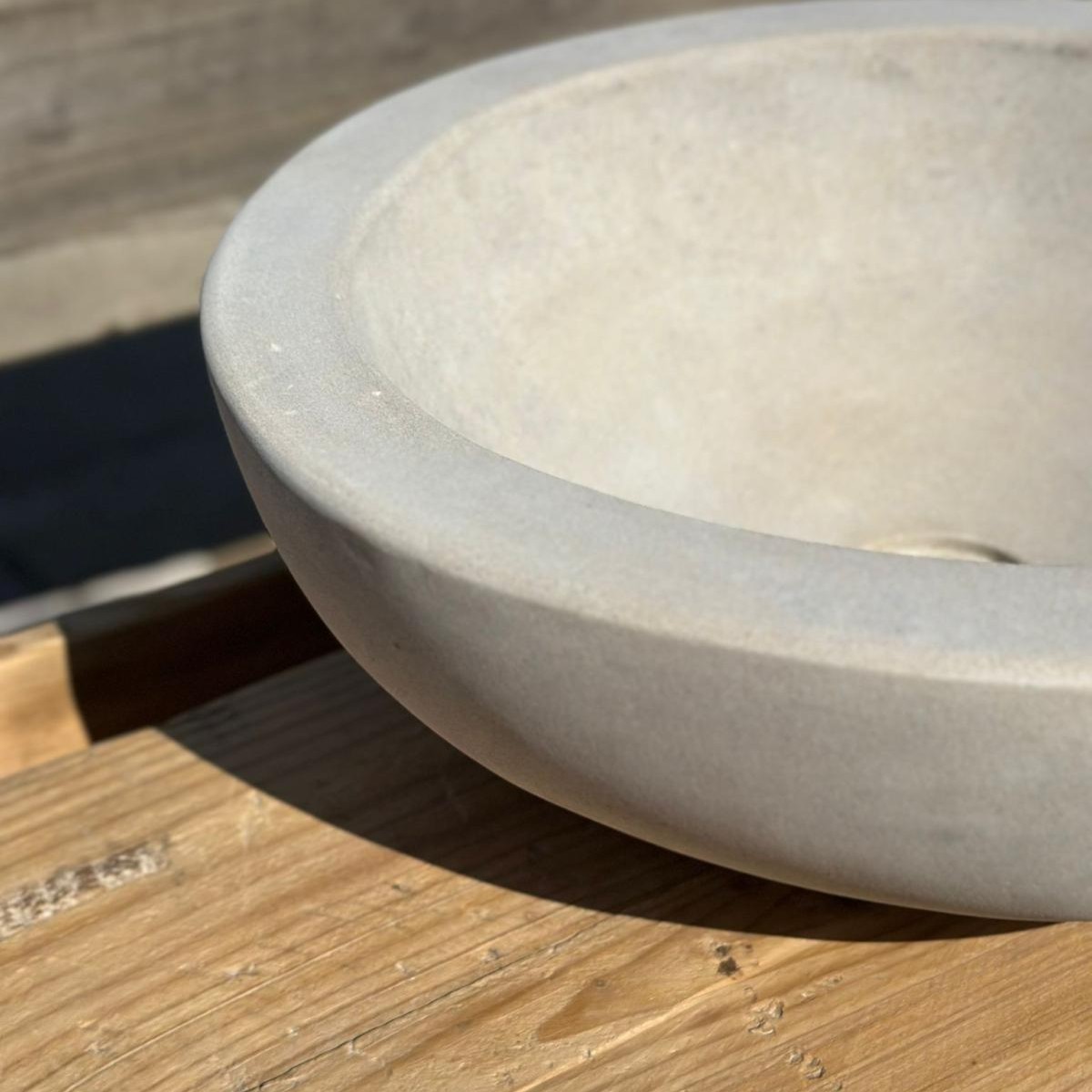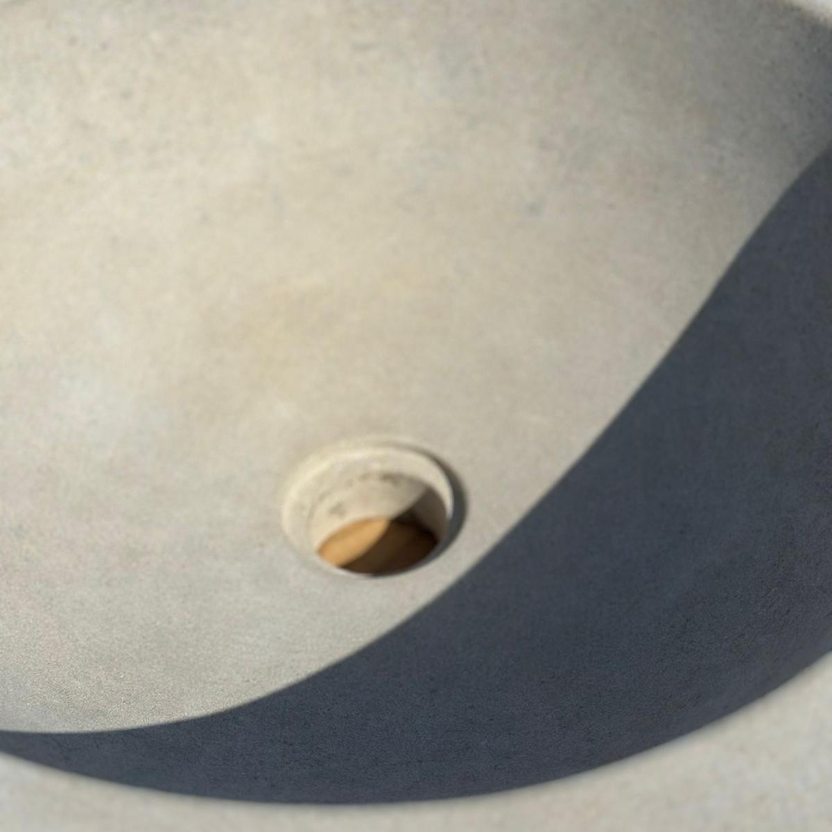 Su interior suavemente pulido contrasta con la textura exterior, resaltando la belleza cruda y a la vez refinada de la piedra. Es una pieza que encaja tanto en baños de estética contemporánea como en espacios rústicos o mediterráneos, aportando un carácter único y artesanal.
