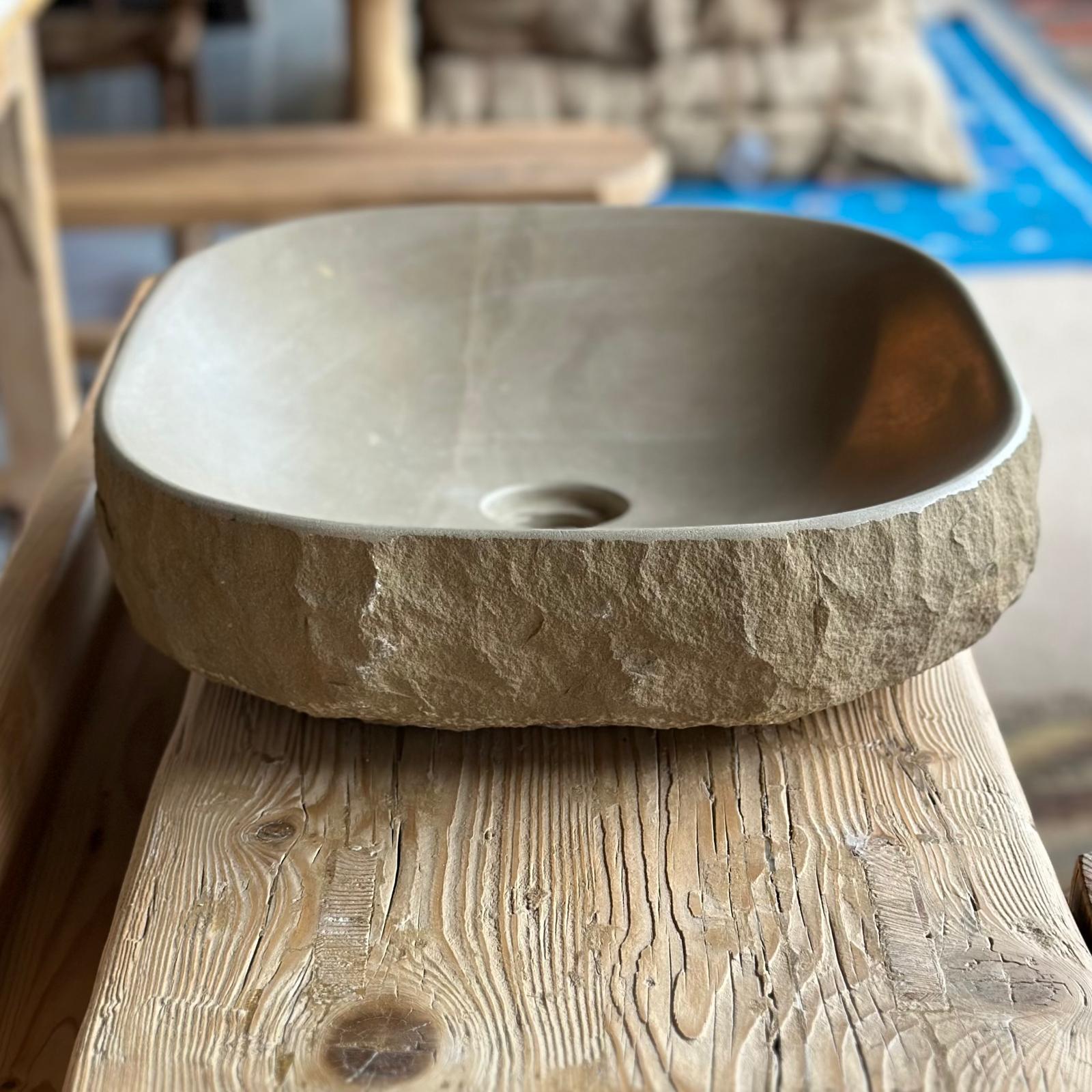 «Terra Fina» nace del equilibrio entre lo simple y lo auténtico. Tallada a mano con piedra natural de Vic, su diseño limpio y compacto respeta la forma original del bloque de piedra, realzando su textura exterior y la suavidad de su interior pulido.